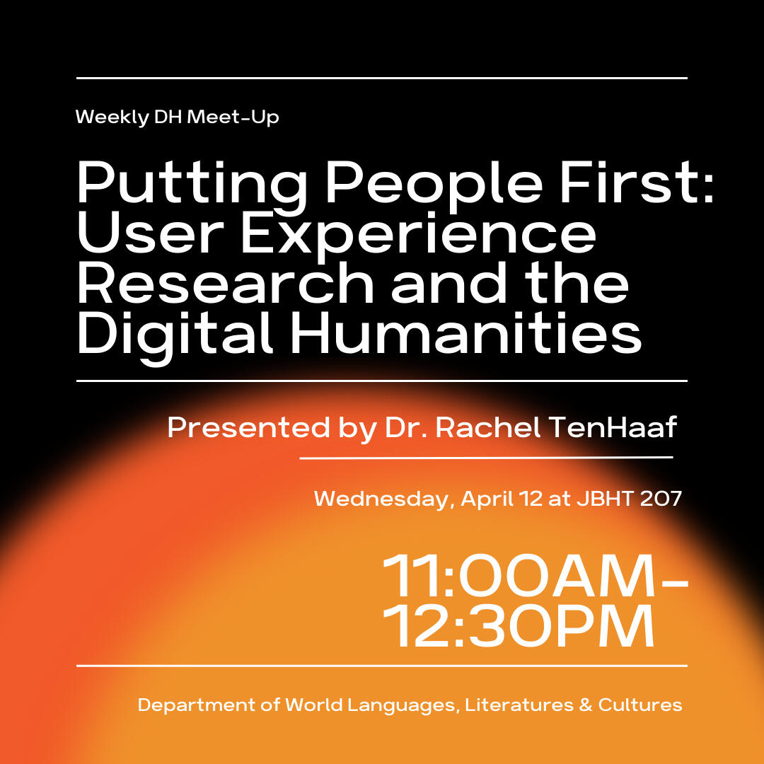 The Weekly DH Meet-up alternates between Wednesdays at 2 pm and Thursdays at 12 pm at the World Languages and Digital Humanities Studio (JBHT 207).